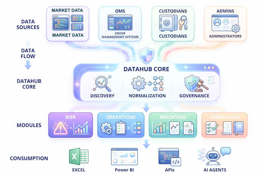 DataHub provides a single governed foundation that connects, normalizes, and delivers data across investment, risk, operations, compliance, and AI systems.